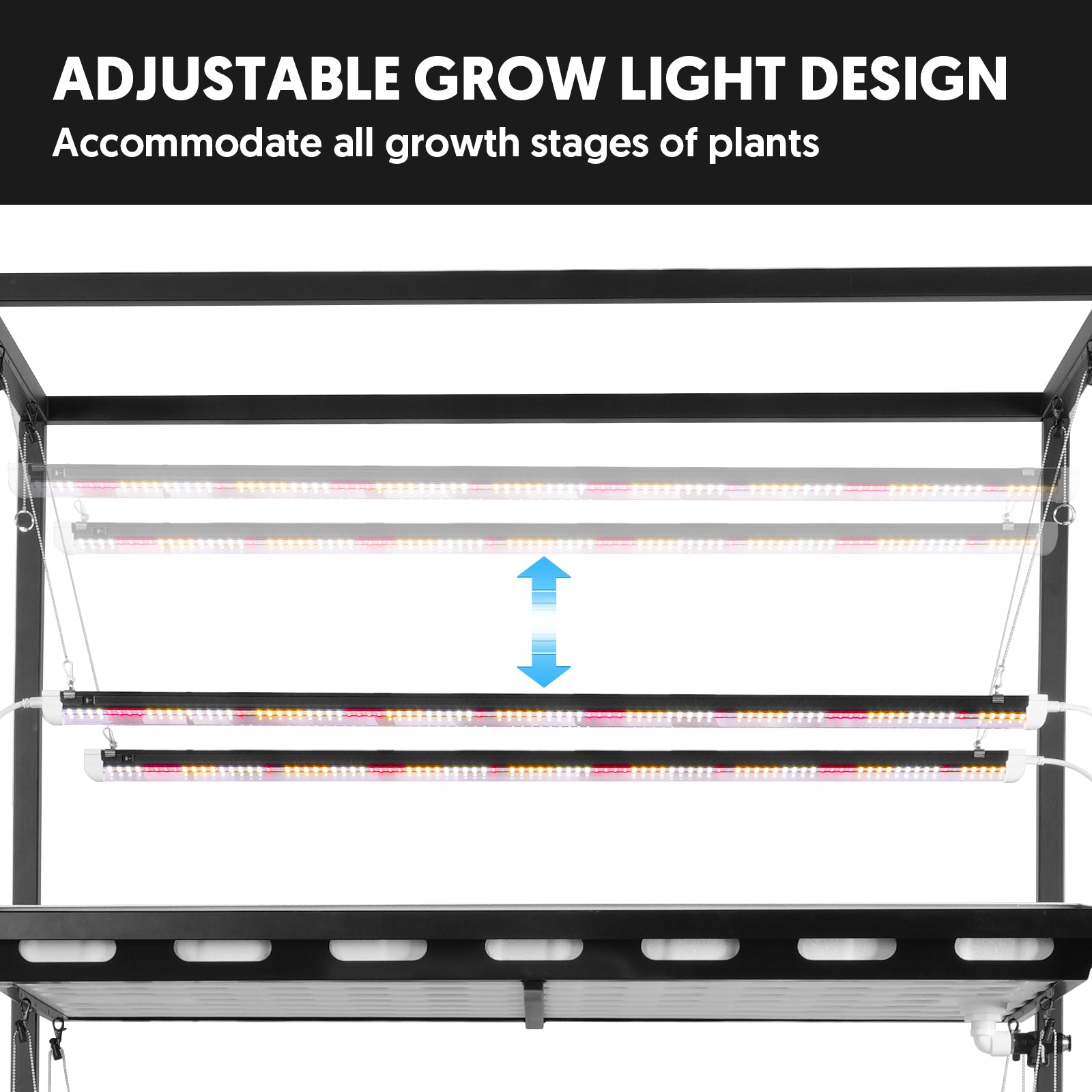 Built from high-strength carbon steel with a corrosion-resistant powder-coated finish, this plant stand system redefines durability. Each of its three tiers supports up to 160 lbs, ensuring robust stability for even the most prolific plant setups. Whether you’re nurturing seedlings, herbs, or microgreens, its heavy-duty framework guarantees long-lasting performance.