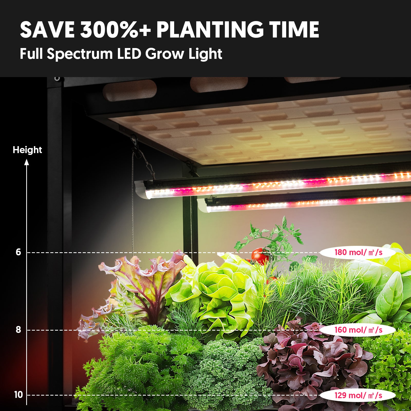 Equipped with six 28W full-spectrum LED grow lights, this system delivers the precise light spectrum the plants need at every growth stage. Easily adjust the height and angle of each light to accommodate seedlings, mature plants, or flowering buds, ensuring consistent, vigorous growth from root to harvest.